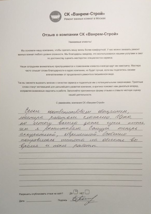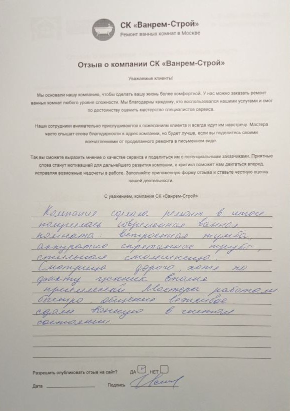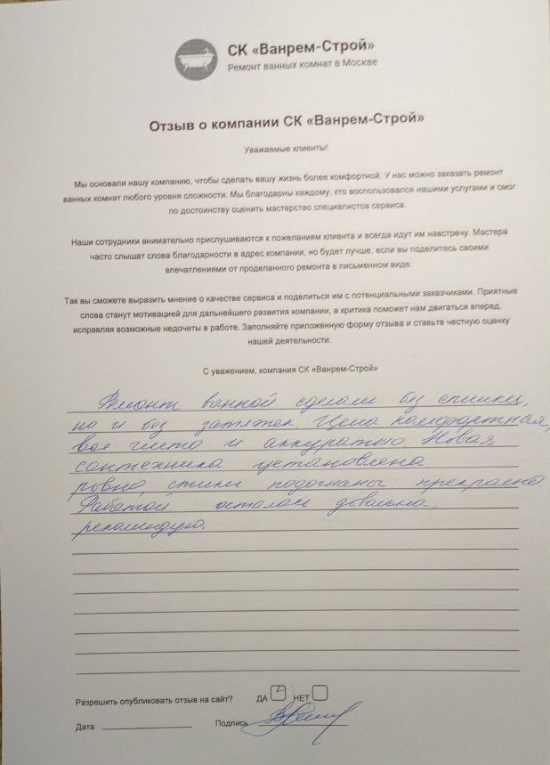 Реальные заказчики дают объективную оценку комплексной работы коллектива сотрудников СК «Ванрем-Строй». Для получения достоверной информации о качестве предоставляемых нами услуг по ремонту ванных комнат, санузлов и туалетов, изучите отзывы клиентов нашей компании.