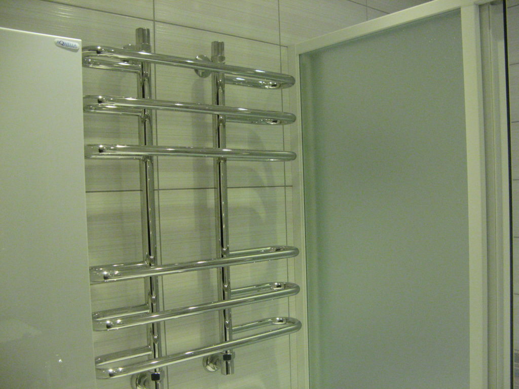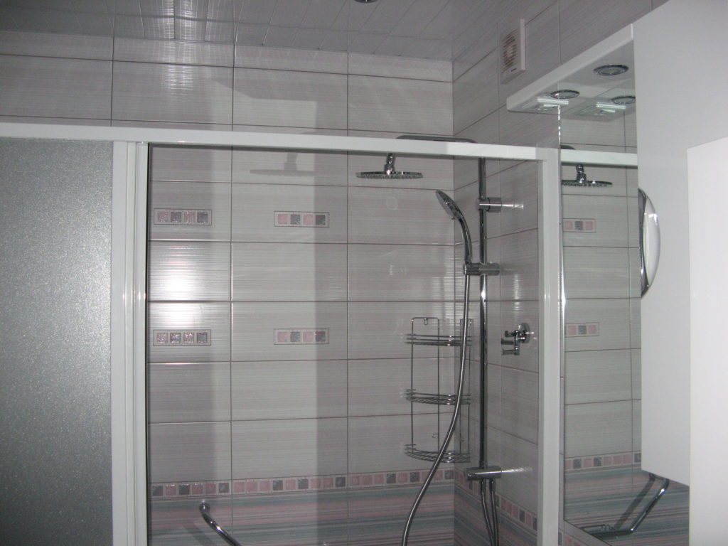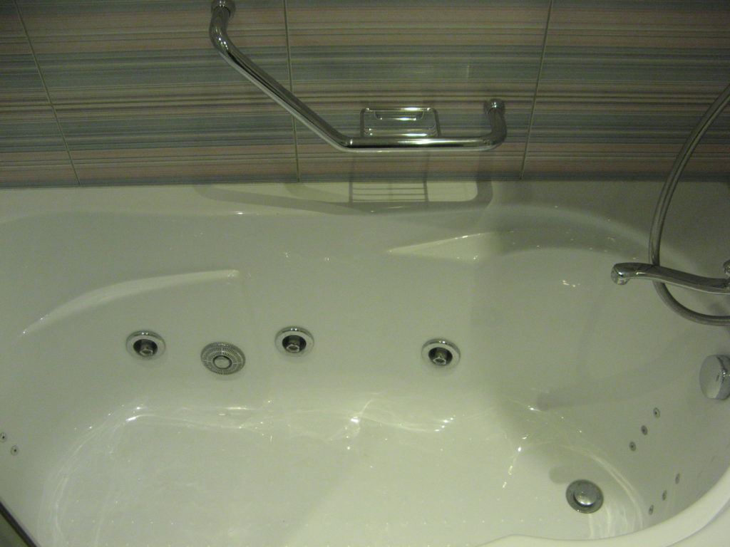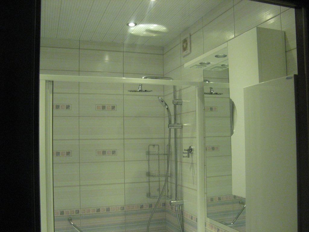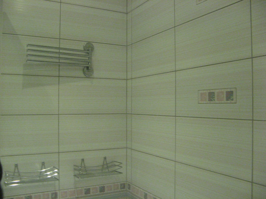 При ремонте раздельного санузла на улице Большая Лубянка наши мастера установили новые металлопластиковые трубы, заменили старую отделку, облицевали поверхности керамической плиткой и установили электрическую вытяжку. В ванной комнате смонтирована ванна с функцией джакузи, раздвижные стеклянные шторки, душ тропический ливень, мойдодыр с тройной тумбой и габаритный полотенцесушитель. В потолок вмонтированы точечные светильники в количестве 6 штук. Для облицовки использовался однотонный и украшенный декором кафель трендового бежевого оттенка с рифленой поверхностью. Узор напольной плитки имитирует классическую дорожку в полоску. В туалете уложена плитки в оливковых и коричневых тонах с рисунком. Общая стоимость ремонта составила 125000 рублей. На черновые материалы было выделено 33 тысячи руб.