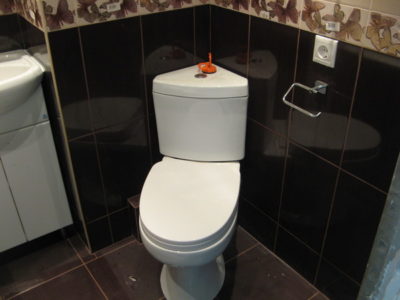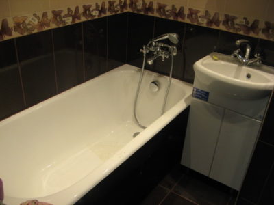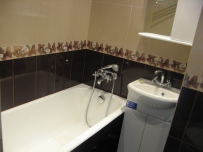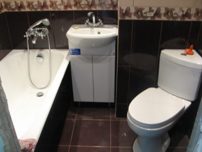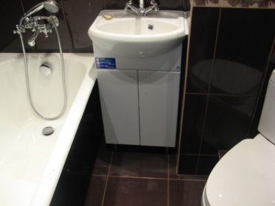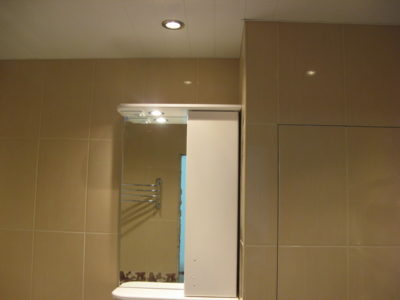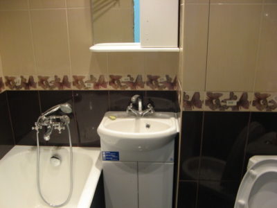 Мы установили унитаз, акриловую ванну с гибким душем, рукомойник со шкафом и зеркалом, а также смонтировали держатели для туалетной бумаги и полотенец. Проведена новая электропроводка и выполнен монтаж электрического полотенцесушителя. Подвесной потолок оформлен пластиковыми панелями со встроенными светильниками. Смета  ремонта — 108000 р. Черновые материалы — 36 тыс. руб.