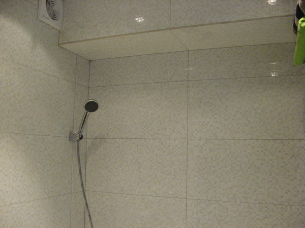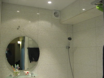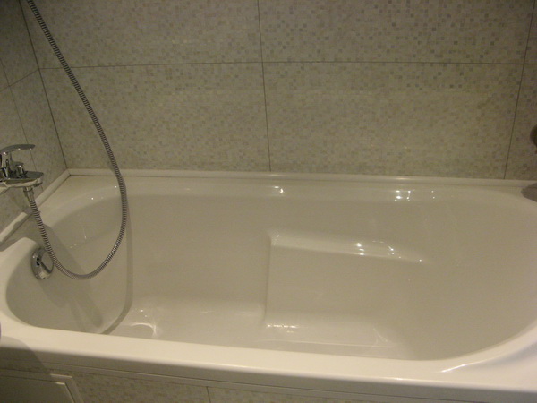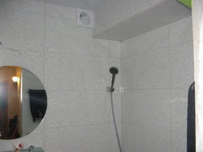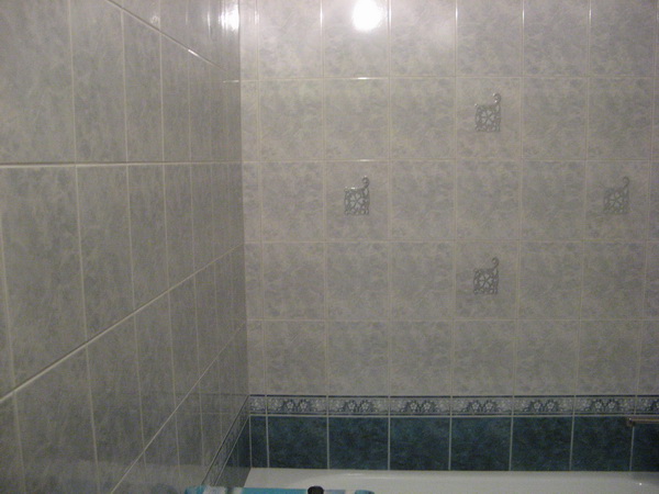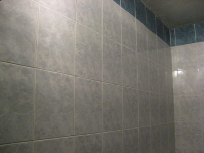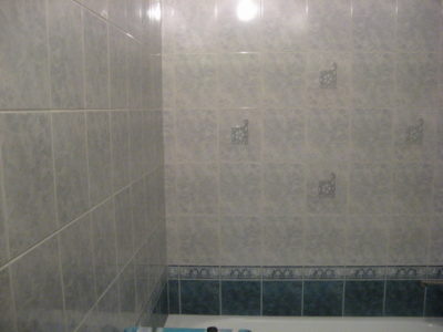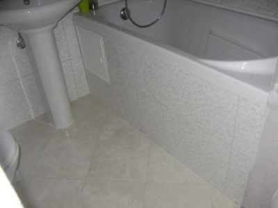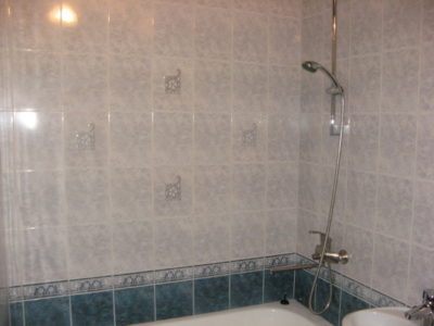 Наша компания выполнила ремонт 2 совмещенных санузлов на улице Салтыковская. Стены облицованы керамической плиткой нежно-голубого оттенка и цвета морской волны. Между контрастной отделкой выложена фреза с цветочным рисунком. На пол уложен кафель в тон общему интерьеру. В комнате установлены ванна с гибким душем, умывальник модели «Тюльпан», унитаз и полотенцесушитель. Инженерные коммуникации скрыты за вертикальными жалюзи, а полость под ванной — экраном с раздвижными дверками. Потолок оформлен пластиковыми панелями. Бюджет ремонта на один санузел составил 117 тысяч рублей. Черновые материалы — 30 тыс. руб.