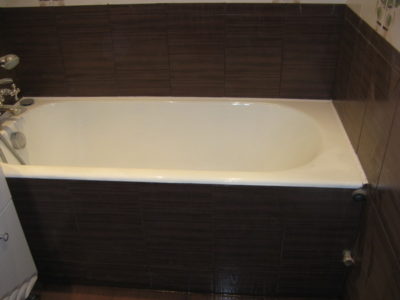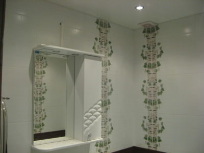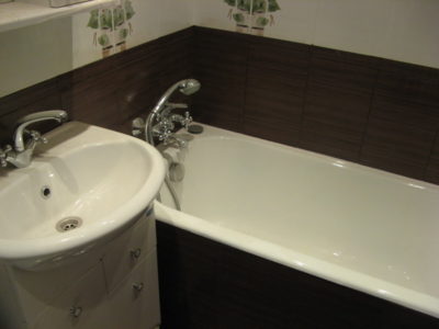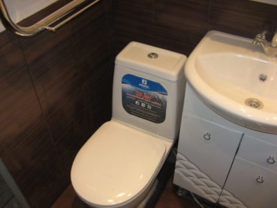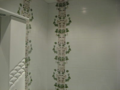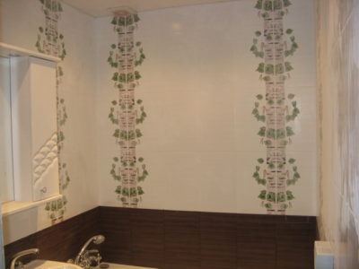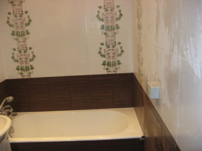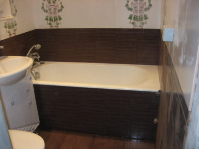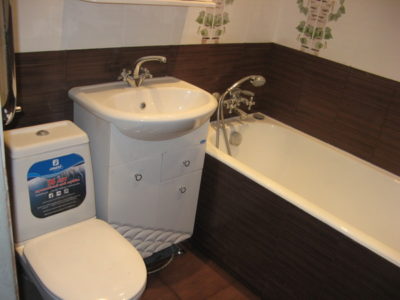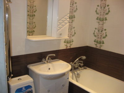 Основной упор при выполнении ремонта санузла на улице Теплый стан был сделан на эргономичность. В небольшом помещении мы установили ванну, мойдодыр на две секции, унитаз и электрический полотенцесушитель. Чтобы визуально расширить пространство, был уложен вертикальный рисунок с имитацией растущей березы на трех стенах. Для отделки поверхностей использовались керамические плиты контрастных белого и шоколадного цветов. Потолок оформлен пластиковыми панелями со встроенными светильниками. Смета на ремонт — 112 тысяч рублей. Черновые материалы обошлись в 34 тыс. руб.