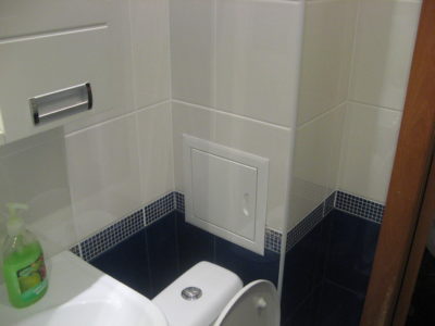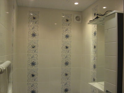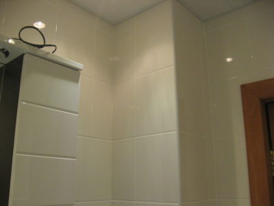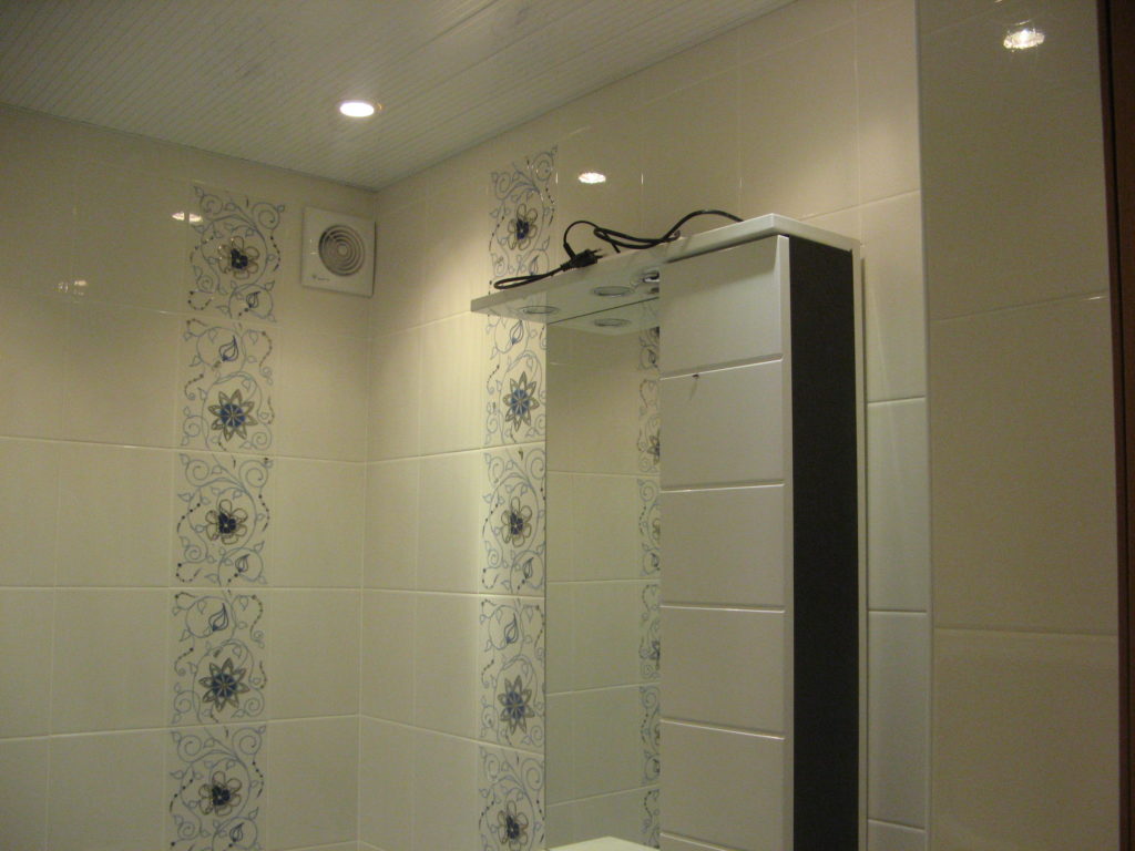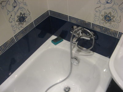 Капитальный ремонт совмещенной ванной и туалета на улице 2 Рощинская занял 22 дня. Мастера полностью демонтировали коммуникации, сняли старую отделку со стен и напольное покрытие. На пол была уложена новая стяжка и синяя плитка, стены облицованы кафелем белого и темно-синего цвета, а потолок декорирован подвесной реечной конструкцией. Для придания комнате нарядного вида над ванной выложен вертикальный узор с цветочным принтом и золотым тиснением. С правой стороны от входа установлены унитаз и подвесной умывальник, над которым мы смонтировали зеркало с боковым шкафом и дополнительными светильниками. Цена ремонта – 98000 рублей. На черновые материалы ушло 31 тыс. руб.