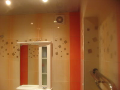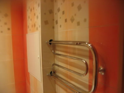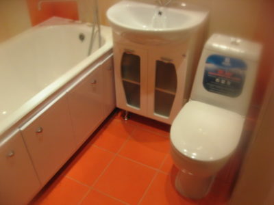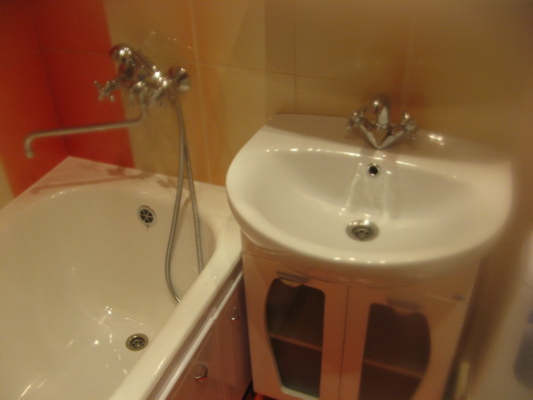 При выполнении ремонта санузла на Варшавском шоссе были использованы яркие отделочные материалы сочного оранжевого и нежного кремового цветов. Эксклюзивности интерьеру придает декоративный орнамент по верхней верхней части стены. Потолок оформлен пластиковыми панелями с вмонтированными точечными светильниками. Нетрадиционным решением стала установка складного полотенцесушителя. Акриловая ванна зашита экраном с дверцами, смонтирован умывальник с тумбой, укомплектованной стеклянными фасадами, а также установлен унитаз стандартной модели. Стоимость ремонта — 124000 руб. Цена черновых материалов — 30890 р.