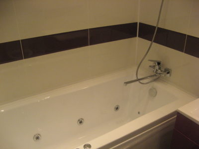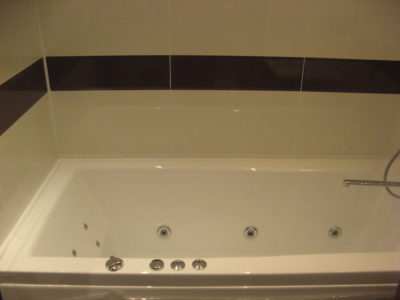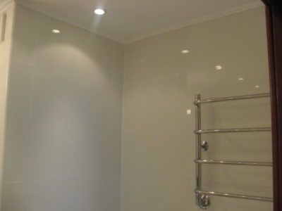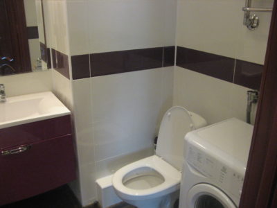 Мы выполнили ремонт совмещенного санузла на улице Коломенская по дизайн-проекту. Особенность помещения – нестандартная планировка с выступающим углом. Для комфорта жильцов мы перенесли унитаз на новое место и расположили его с правой стороны от входа, а перед ним установили стиральную машину. Центральное место комнаты перед входной дверью занимают умывальник с подвесной тумбой и большое зеркало. Вдоль глухой стены смонтирована ванна с функцией джакузи, а по бокам установлены полотенцесушитель и держатель для душа. При отделке стен использовался кафель молочного цвета. Придать интерьеру объема позволила контрастная фреза и фасады мойдодыра в темных тонах. Стоимость ремонта – 122000 рублей. Цена черновых материалов – 30 тыс. руб.