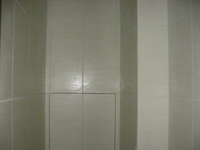 Наша компания выполнила ремонт туалета на улице Юных ленинцев. Мы отошли от принципов классического оформления стен в два цвета и облицевали боковые поверхности белоснежным кафелем. На пол уложена зеленая плитка с фактурным рисунком. С ее помощью также выделена туалетная зона. Защитный экран для коммуникаций замаскирован под общий интерьер. Потолок оформлен пластиковыми панелями со встроенными светильниками. Смета на ремонт — 28 тысяч рублей. Стоимость черновых материалов — 7600 р.