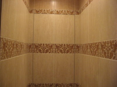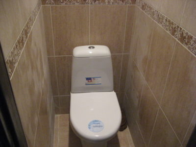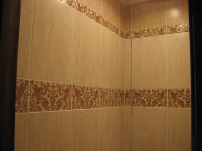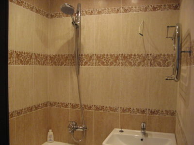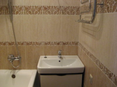 Наша компания выполнила ремонт в малогабаритной квартире, эргономично организовав пространство в ванной комнате и туалете. Для отделки поверхностей использовалась керамическая плитка нежно-розового и белого цвета. Придать нарядности удалось за счет горизонтальной укладки трех полос декоративной фрезы по всему периметру стен. Мы установили умывальник с тумбой на три ящика рядом с акриловой ванной, скрытой за защитным экраном. На глухую стену навешен душ с крупным распылителем, а справа от него смонтирован полотенцесушитель. Потолок оформлен пластиковыми панелями с точечными светильниками. Оба помещения выполнены в едином стилевом решении. Стоимость черновых материалов составила 32 тыс. 150 руб. Полная цена — 123900 рублей.