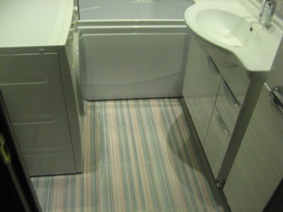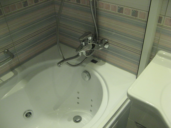Полы и стены ванной комнаты облицованы керамической плитой с горизонтальным рисунком. В помещении установлены ванна с функцией джакузи, раздвижные шторы, умывальник с тумбой, полка для полотенец, полотенцесушитель, вертикальный шкаф и стиральная машина. Стоимость черновых материалов — 32200 руб. Цена ремонта — 120 тыс. 900 руб.