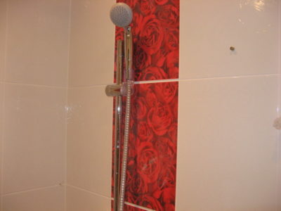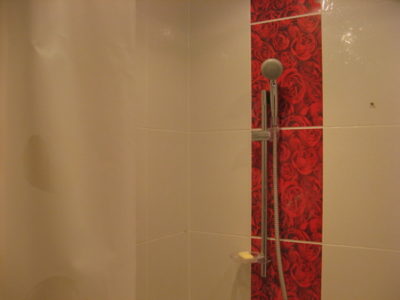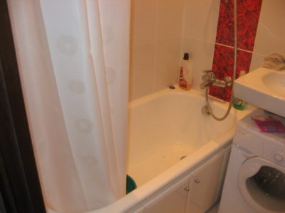 Наша компания выполнила ремонт ванной комнаты и туалета в квартире, расположенной на улице Кольская, в эксклюзивном дизайне под ключ. Для облицовки поверхностей использовалось два типа керамической плитки: однотонная нежного кремового цвета и украшенная ярко-красными розами. Нарядности интерьеру придают позолоченные элементы декора и аксессуары. Для экономии места стиральная машина установлена под навесной умывальник. В туалете распределительный коллектор спрятан за вертикальными жалюзи. На стену около унитаза вмонтированы держатели для бумаги и освежителя воздуха. Общая сумма составила 124200 рублей. Черновые материалы — 32 тысяч.