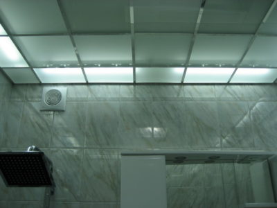 В помещениях мы установили акриловую ванну, мойдодыр и унитаз с функцией биде. Инженерные коммуникации скрыты за защитным экраном. Потолок оборудован стеклянными подвесными панелями, за которыми смонтированы светодиодные лампы.