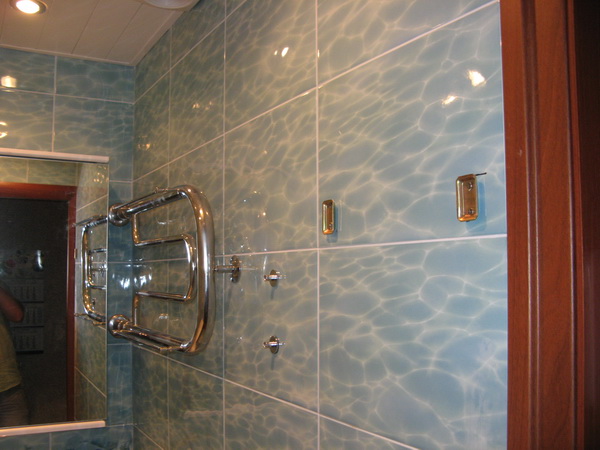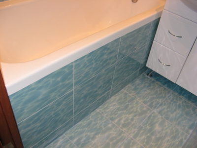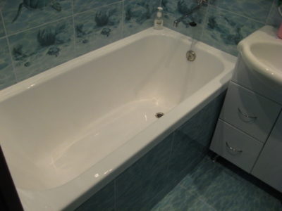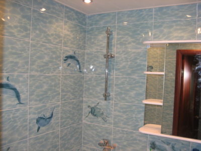 Главным достоинством дизайна при ремонте ванной комнаты в Химках стало декорирование стен керамической плиткой с изображением дельфинов, черепах и других обитателей моря. Мы выполнили отделку стен и пола кафелем нежно-голубого цвета с белыми прослойками. Установили подвесной потолок из пластиковых панелей со встроенными точечными светильниками. Мы смонтировали в комнате ванну с защитным экраном, мойдодыр и электрический полотенцесушитель. Бюджет ремонта составил 64 тысячи рублей. Черновые материалы — 24 тыс. р.
