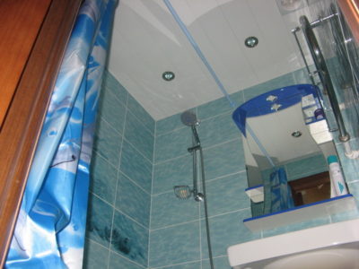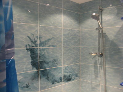 Наша компания выполнила ремонт ванной комнаты на бульваре Любы Новоселовой. Отличительная особенность дизайна — оформление отделки со стилизацией морского дна. Впечатление усиливают фактурный рисунок погибшего корабля, а также изображения дельфинов по всему периметру помещения. На пол уложена керамическая плитка нежно-голубого цвета под общий интерьер. Таким же кафелем облицован защитный экран под ванной. Кроме основного сантехоборудования смонтирован подвесной умывальник, под которым установлена стиральная машина. На стену навешано зеркало, установлены полотенцесушитель, подставка для гибкого душа и перекладина для штор. Потолок оформлен пластиковыми панелями со встроенными светильниками.